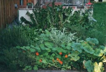 An der Terasse und in größtmöglicher Nähe zur Küche befindet sich ein großes und gut sortiertes Kräuterbeet. Neben Kapuzinerkresse (vorne Mitte) gedeihen hier Thymian (vorne links), Rosmarin (dahinter), Sauerampfer (links hinten), Salbei (Bildmitte), Schnittlauch (hinten rechts), Ysop (dahinter) und ganz hinten Meerrettich. |