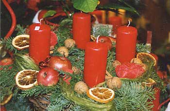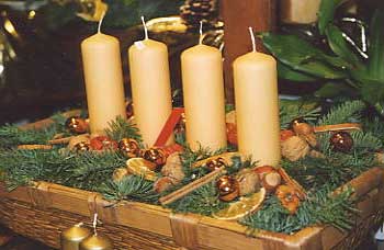 Alternative zum klassischen Adventskranz und mit Sicherheit auch ein attraktiver Blickfang ist dieser herrlich geschmückte Korb mit Champagnerfarbenen hohen Kerzen. |