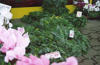 Die gebundenen grünen Kränze werden von Frau Kittlass aus Finkens'Garten geliefert. Natürlich kann man auch diese 'Rohlinge' kaufen, um dann bei der Verzierung der Kränze seiner Fantasie freien Lauf zu lassen. |