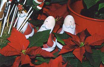Die tönernen Nikoläuse scheinen noch auf der Suche nach einem passenden Adventskranz zu sein. Aber auch hinter den dunkellroten Weihnachtssternen kommen sie gut zur Geltung. |