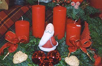 Stolz scheint dieser Deko-Nikolaus vor den unterschiedlich großen roten Kerzen des Weihnachtsgestecks zu posieren. Die Klassiker Rot und Grün sprechen nach wie vor die meisten Kunden an. |