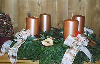 Geheimnisvoll schimmern diese Kerzen mit ihrem Satinglanz und sind eindeutig die Hauptattraktion des ansonsten schlichten Kranzes. |