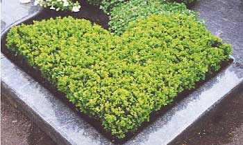 Auf dem gleichen Grab wurde außerdem viel mit Buchs gestaltet, so wie dieses Herz aus kleinblättrigem Buchs, dass die liebevolle Verbundenheit mit der Verstorbenen über den Tod hinaus symbolisieren soll. | |