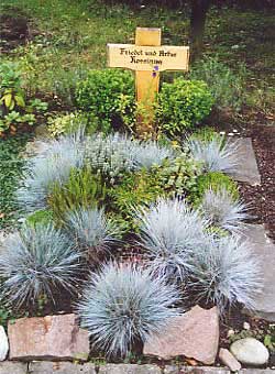 Viel geordneter zeigt sich dieses Grab. Die abwechslungsreiche, ja fast schon verspielte Bepflanzung mit vielen Polsterstauden bekommt einen "strengen" Rahmen, was beim Betrachter für eine interessante Spannung sorgt. |