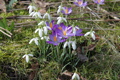 Ein paar Tage später stoßen die ersten lilafarbenen Krokusse zu den sich langsam öffnenden Schneeglöckchen. |