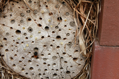 ...ebenfalls im o.g. Buch beschrieben werden viele Möglichkeiten des aktiven Artenschutzes innerhalb des Trockenmauerbaus. Im abgebildeten Beispiel wurden angebohrte Baumscheiben in die steinerne Umrandung eines Hochbeetes integriert. Insekten wie die Rote Mauerbiene freuen sich über diesen geschützten Lebensraum!