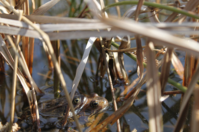Auch am Gartenteich kehrt der Frühling in Form von sich paarenden Fröschen ein. Tagelang konnte ich dieses Pärchen beobachten, bis das Weibchen schließlich eine große Menge Laich ablegte. Nun warten wir auf das Schlüpfen der Kaulquappen und hoffen sehr, dass im Teich lebende Libellenlarven ein paar von ihnen leben lassen, damit aus ihnen im Laufe des Sommers kleine Frösche werden können.