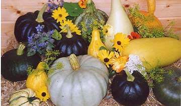 Die letzten Kürbisse des Jahres in den typischen 'Winterfarben'. Vorne in der Mitte ein 'Jarrahdale', eine aus Australien stammende Kürbisart mit ausgezeichnetem Geschmack. |