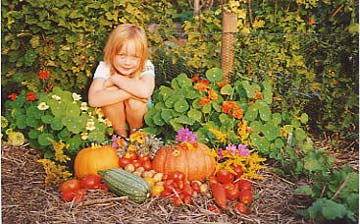 Hier präsentiert Lisa stolz die Ernte des Tages. Sie hat die Kürbisse, Tomaten und Kartoffeln mit blühenden Pflanzen geschmückt. |