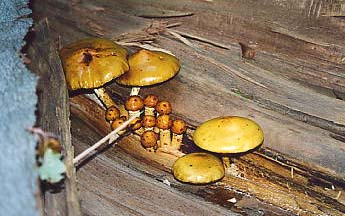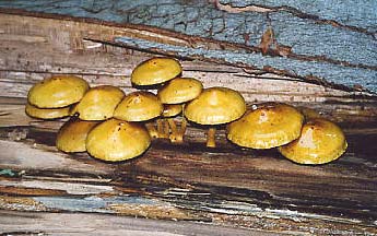 Schwer zu bestimmen waren diese leuchtenden Pilze mit leicht schleimigem Hut. Sie wuchsen auf einer umgestürzten Buche. |