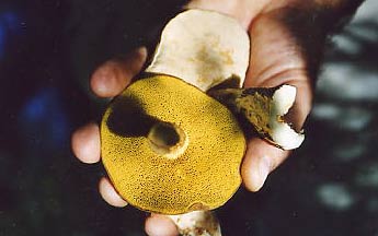 Wir kamen tiefer in den Wald hinein und es wurde dort auch dunkler. Aber Pilze lieben ja häufig die etwas lichteren Plätze. Mit der Zeit entwickelt man dann auch ein Gespür dafür, wo man suchen sollte. Es drängte einen unwillkürlich zu den Waldlichtungen. Hier fühlt sich auch die Ziegenlippe (Xerocomus subtomentosus) wohl (vorne im Bild). Sie besitzt leuchtend gelbe Röhren, die im Alter grünlich bis bräunlich-gelb werden. Dieser Pilz ist ein guter Speisepilz und lässt sich auch gut trocknen. |