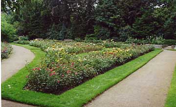 Um einen mittleren Rosengarten gruppieren sich hier beiderseits zwei Nebengärten, die jeweils durch zwei geschnittene Platanenreihen begrenzt werden. |