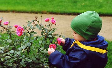 Ein noch sehr junger Rosenliebhaber untersucht hier die Blüten einer rosablühenden Strauchrose. Aber keine Sorge: Die zarten Blüten haben diese Prüfung unbeschadet überstanden. |