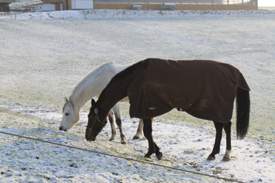 Noch grasen die beiden Schönheiten friedlich auf der verschneiten Weide. Doch, mal ehrlich, glauben die zwei ernsthaft daran, hier noch frisches Grün zu finden? |