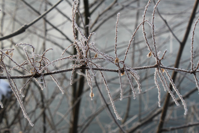 Es kam uns fast gespenstisch vor, als nach nur wenigen Metern Fußweg plötzlich die Luft vor Kälte geradezu erstarrte. An einer tiefer gelegenen Uferstelle waren alle Bäume, Sträucher und Gräser mit einer zarten Reifschicht umhüllt. Die kalte feuchte Luft kroch mit eisiger Gewalt durch unsere warmen Jacken hindurch. Eine zarte Hülle aus gefrorenem Wasser'dampf' stand so manchem Strauch jedoch außerordentlich gut 'zu Gesicht' |