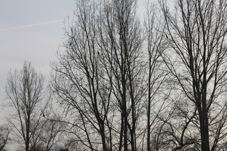 Immer wieder entdeckten wir den ein oder anderen Kormoran auf oder am Wasser. Doch achteten die scheuen Vögel darauf, dass Beobachter ihnen nicht zu nahe kamen. Dann erreichten wir diese Stelle und sahen gleich vier der interessanten Wasservögel in den Baumwipfeln am gegenüber liegenden Ufer der Sieg sitzen. |