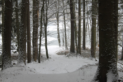 Und wieder gings bergab zu meiner Lieblingsstelle am Ufer der Wahnbachtalsperre. Das Auge wird mit der Zeit geschärfter für jede kleine Veränderung in der verschneiten Landschaft |