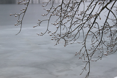 Im Vordergrund hängen knospende Weidenzweige über der dünnen matt schimmernden Eisdecke. Im Hintergrund zeigt sich die Wasserfläche noch offen und glänzend |