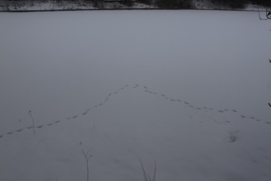 Hier wurde ein Fuchs vom Winter 'aufs Glatteis geführt'. Der Übergang vom verschneiten Ufer zur ebenfalls zugeschneiten Eisfläche ist kaum noch zu erkennen.