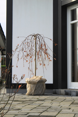 zu empfehlen. Winterschutz für Kübelpflanzen: Kübelpflanzen und hier vor allem mediterrane Kräuter vertragen zwar eine Menge Frost, dennoch gehen sie in kalten Wintern oft ein. Besonders gefährdet sind die Pflanzen, die im Kübel wachsen. Hier sollte man immer auf einen guten Abzug achten, da Staunässe im Winter mit Sicherheit zum Absterben der Pflanzen führt. Man sollte die empfindlichen Kräuter auch komplett in Vlies oder Kokosmatten einpacken, also in diesem Fall auch die oberirdischen Teile,- die oft genug noch nicht ausreichend verholzt sind-, vor starken Frösten schützen. Bei einheimischen Gehölzen oder Ziersträuchern im Kübel reicht es meistens aus, nur den Wurzelbereich vor starkem Frost zu schützen (Foto links): |
