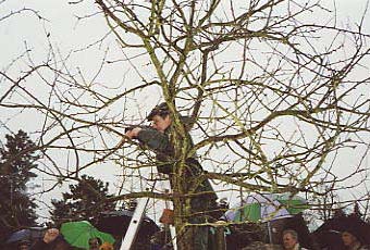 Es wurden zwei größere Äste herausgesägt (z.B. der Ast links im Bild, über der Hand von Karl Friedrich Ley), die im Vergleich zum Mitteltrieb sehr stark gewachsen waren und verhinderten, dass sich eine lichte Krone ausbilden konnte. |