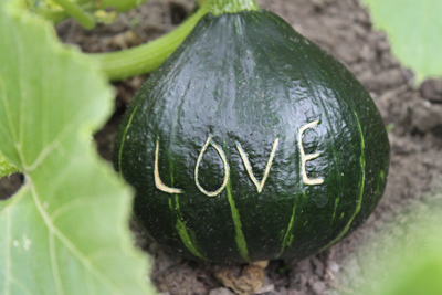 Ritzt man in ganz junge Kürbisfrüchte mit einem dünnen Nagel nur oberflächlich Buchstaben oder andere Zeichen ein, so entstehen später solch aussagekräftige Narben auf den ausgewachsenen Früchten: