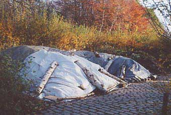 Die großen Komposthaufen verbringen den Winter gut geschützt unter einer Folienabdeckung. Im Sommer wird die Anlage vom Blattwerk der Kürbispflanzen beschattet, die sich hier breit machen dürfen und gelegentlich trifft man auf eine ganze Schar von Hühnern, die auf dem Kompost nach Futter suchen. |