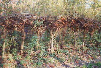 Das große Bienenhaus mit begrüntem Dach wird von diesem perfekt geflochtenen lebenden Weidenzaun umgeben. So ein Zaun hat den Vorteil, dass sein Aussehen niemals langweilig wird. Im Sommer belaubt, im Winter mit künstlerisch ansprechendem Flechtwerk wird er über die Jahre hinweg immer schöner und ausdrucksvoller. |
