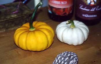auch Bischofsmütze genannt, links daneben ein weißer Squash.