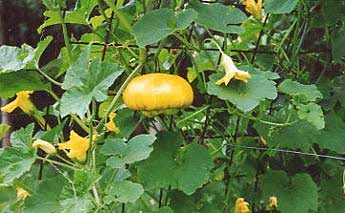 dahinter in der Mitte ein cremfarbener Spagettikürbis, den man am