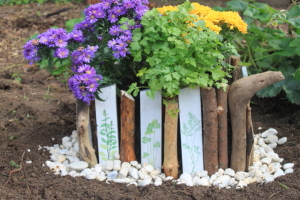 Die Hochbeetumrandung aus Schwemmholz und weiß lackierten Pflanzensteckern strahlt mit den Pflanzen um die Wette. Hier gedeihen Herbstastern und glatte Petersilie!