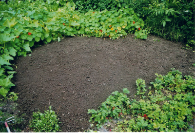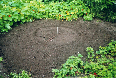 Kraterbeete können Durchmesser von 3, 30 oder 300 m haben. Für den Garten ist die erstgenannte Größe wohl am ehesten geeignet. In meinem Schrebergarten war der Platz so begrenzt, dass ein Kraterbeet auf kleinstem Raum entstand. Das gesamte Beet hatte später einen maximalen Durchmesser von ca. 3 m. Die für das Beet vorgesehene Fläche wurde zunächst gründlich von Unkräutern befreit. Vor allem Wurzelunkräuter sollten peinlichst entfernt werden. Mit einem kleinen Pflock, um den eine Schnur gebunden wurde, lassen sich exakte Kreise ziehen. Hier wurde markiert, wie groß der Innenraum des Kraters am Ende werden soll.
