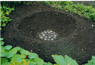 In die Mitte der Kuhle können Basalt-Pflastersteine in den Boden eingelassen werden. So entsteht eine gut befestigte Fläche, um von dort aus an den 'Kraterhängen' zu arbeiten. Basaltsteine haben den Vorteil, dass sie besonders viel Wärme speichern, die sie in kalten Nächten an die Umgebung abgeben. Soweit so gut. Nun ist die Fantasie des Krater-Gärtners gefragt! Der Wall wird schön modelliert, damit hier viele Pflanzen wachsen können. |