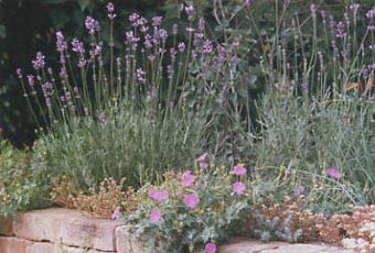 Auf diesem Hochbeet aus alten Klinkern, das mit sandigem Boden gefüllt wurde, blüht im Juni Lavendel (Lavendula angustifolium) und Blut-Storchschnabel (Geranium sanguineum). | |
