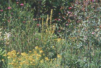 Ebenfalls im Juni blühen schmalblättriges Johanniskraut (gelb, vorne), Feldbeifuß (dahinter mit rötlichen Stängeln), Karthäusernelke (rosa) und schwarze Königskerze (gelb, im Hintergrund). Dazu gesellt sich noch eine Zwerg-Felsenbirne (Amelanchior ovalis ‚Pumila', rechts im Bild). | |