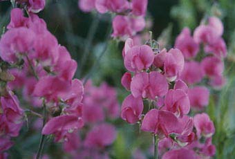 Einen sonnigen Standort an Zäunen liebt die breitblättrige Platterbse (Lathyrus latifolius), die sich auf dem sandigen Boden auch rege versamt. | |