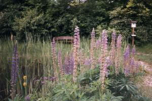![]() Blaue Lupinen, gelbe Schwertlilien und Rohrkolben an einem großen Folienteich |