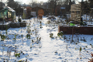 Neugierig machte ich mich heute auf den Weg in den Schrebergarten. Noch vor Weihnachten hatte es den ersten Schnee gegeben, was doch für unsere milde Gegend hier sehr ungewöhnlich ist.