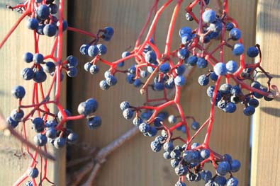 Ein interessantes Farbenspiel bieten uns zurzeit die Beeren des wilden Weins. Sie stellen eine sehr beliebte Winter-Nahrungsreserve für Amseln, Stare und viele andere dar.