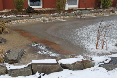 Gut erkennbar ist bei diesem Schwimmteich der Übergang zwischen Ufer- und Schwimmzone, der hier durch rote Natursteinbrocken markiert wurde. Stehen gelassene abgestorbene Halme von Schilf oder Binsen sorgen für eine gute Durchlüftung des Wassers unter einer geschlossenen Eisfläche. Dadurch können im Winter entstehende Faulgase besser aus dem Wasser entweichen. Das ist vor allem für im Teich überwinternde Tiere (Teichfrösche u.a.) wichtig