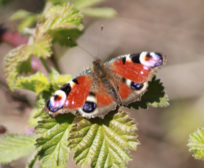 Ein Frühlingsbote, der meinem Tele nicht schnell genug entkommen konnte: Tagpfauenauge auf Brombeerranke