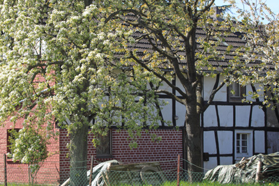 Gepflegtes Fachwerk schmückte sich hier ganz frühlingsfein mit blühenden Kirschbäumen |