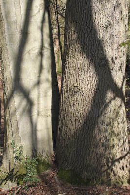.Wir streiften den Ort 'Happerschoß', danach ging es durch Wald und Wiesen wieder hinunter (Richtung Süden) zu Schloß Allner. Im Wald waren die Temperaturen angenehm. Sonne drang dennoch durch die noch spärliche Belaubung der Waldbäume. Eine enge Baumfreundschaft verbinden hier Buche und Eiche. Der Abstand zwischen den beiden Baumriesen schmilzt bedenklich dahin.