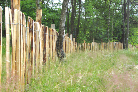 Im Kontrast hierzu steht dieser gerade erst gesetzte Zaun aus einfachen Holz-Staketen. Naturbelassen und mit Draht gebunden nimmt er verspielt Kontakt auf mit den zu seinen Füßen blühenden Gräsern.