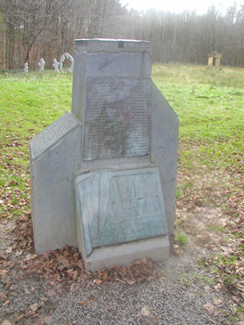 Als wir schließlich Much erreichten, kamen wir zu dieser Wiese mit einer Reihe von Skulpturen, sowie diesem Mahnmal. Exakt an dieser Stelle befand sich das Internierungs-Sammellager Much, von wo aus viele Juden des Rhein-Sieg-Kreises im Jahre 1942 in verschiedene Konzentrationslager, viele in das KZ Theresienstadt, verschleppt wurden. Ihre Namen sind hier zum Gedenken und zur Mahnung eingraviert worden.
